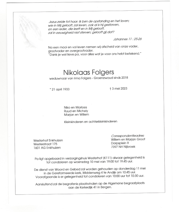 Er is gelegenheid om de familie te condoleren en afscheid te nemen op woensdag 10 mei tussen 19.00 en 19:45 uur in verzorgingshuis Westerhof(K111).