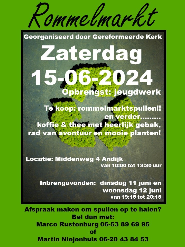 Rommelmarkt zaterdag 15 juni Van 10:00 tot 13:30 Opbrengst is voor het jeugdwerk. Iedereen van harte welkom Webmaster2024-06-14T09:50:29+02:0014 juni 2024| Deel dit bericht, kies je platform! FacebookX