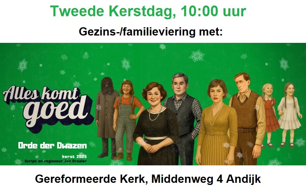 Tweede Kerstdag, gezinsviering. De christelijke theatergroep Orde der Dwazen komt Tweede Kerstdag in Andijk met de voorstelling ‘Alles Komt Goed’. Dit is een stuk dat voor de hele familie leuk en leerzaam zal zijn. Iedereen van harte welkom om 10:00 uur in de Gereformeerde Kerk, Middenweg 4 in Andijk.