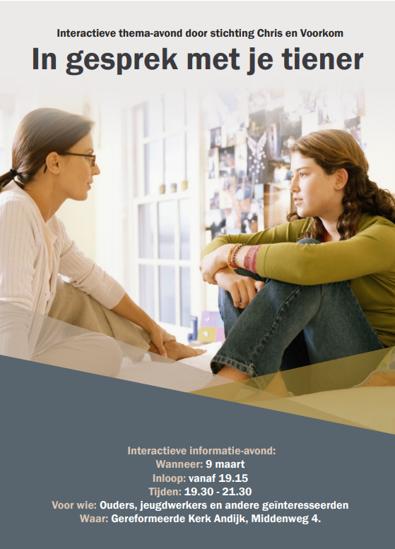 Op maandagavond 9 maart organiseren we samen met de WEG een (voorlopig) laatste thema-avond rondom jongeren. Dit doen we in samenwerking met de stichting Chris en Voorkom. Het thema van deze avond is: in gesprek met je tiener.