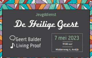 7 mei om 19 uur is de laatste jeugddienst van het seizoen. Geert Balder komt spreken over het werk van de Hilige Geest (het is tenslotte bijna Pinksteren). Living Proof speelt de muziek en zang, [...]
